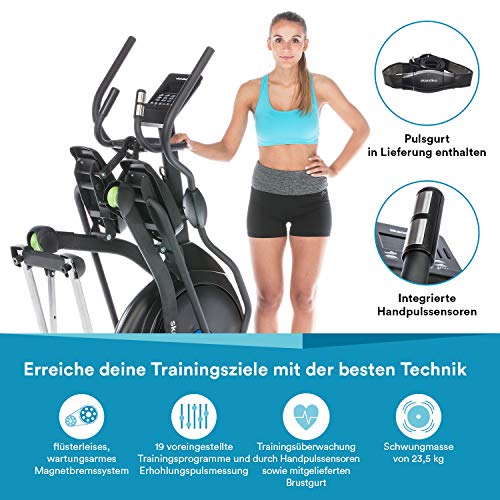 Außerdem ist es möglich, den Crosstrainer mit dem mitgelieferten Brustgurt zu verbinden, um sich seinen Puls genau während seinen Trainings Sessions anzeigen zu lassen. Dieser ist sehr angenehm zu tragen und ist besonders für ambitionierte Läufer oder Personen mit Herz Problemen eine großartige und hilfreiche Option. Die Stabilität kann sich ebenso sehen lassen, denn mit bis zu 150 kg Maximalbelastung ist es definitiv eines der stabilsten Geräte auf dem Markt. Zudem verfügt das Skandika Heimtrainingsgerät über eine gute Schwungmasse von 23,5 kg und über ein effektives und auf Magnettechnologie basierenden Bremssystem, was besonders das Abbremsen, nach intensiven und schnelleren Einheiten angenehm vollführt. Einzig der Preis von knapp 850 € ist enorm hoch und fällt eher unter die negativen Punkte. Doch Qualität hat wie immer auch seinen Preis.